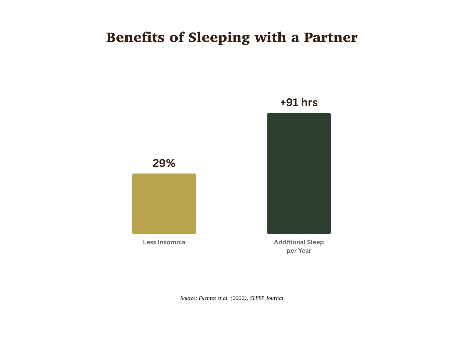 As if the wealth and longevity arguments weren't enough, a 2022 study by Fuentes et al. in the journal SLEEP found that people who share a bed with a partner experience 29% less insomnia and gain an additional 91 hours of sleep per year.